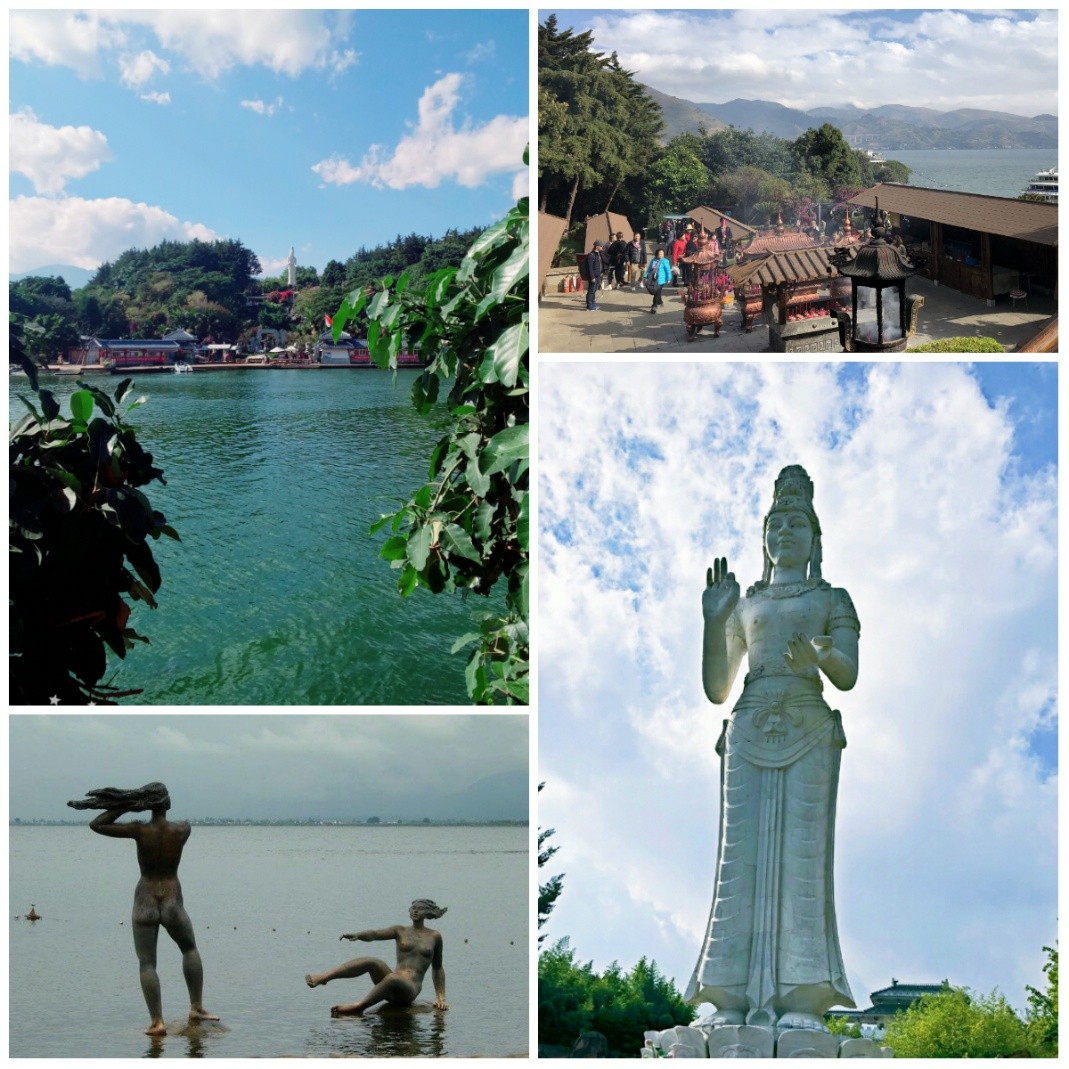 当游轮停靠在南诏风情岛时,大家都被曾经的南诏国美景吸引了,岛上被绿绿葱葱的植被覆盖着,仿佛是冬天里的一件绿色保暖外套。作为洱海的三大海岛之一,南诏风情岛东靠著名佛教圣地鸡足山,它的岛中央矗立着一个巨大的玉观音雕像,昭示着佛教在大理的地位,也引来了不少佛教虔诚徒烧香礼佛。站在岛上不但可以俯瞰洱海的美景,还能遥望苍山的概貌,在岛边还有一立一卧两个“洱海的女儿”的铸铜雕像,与岛上天然岩石“醉八仙”相呼应。