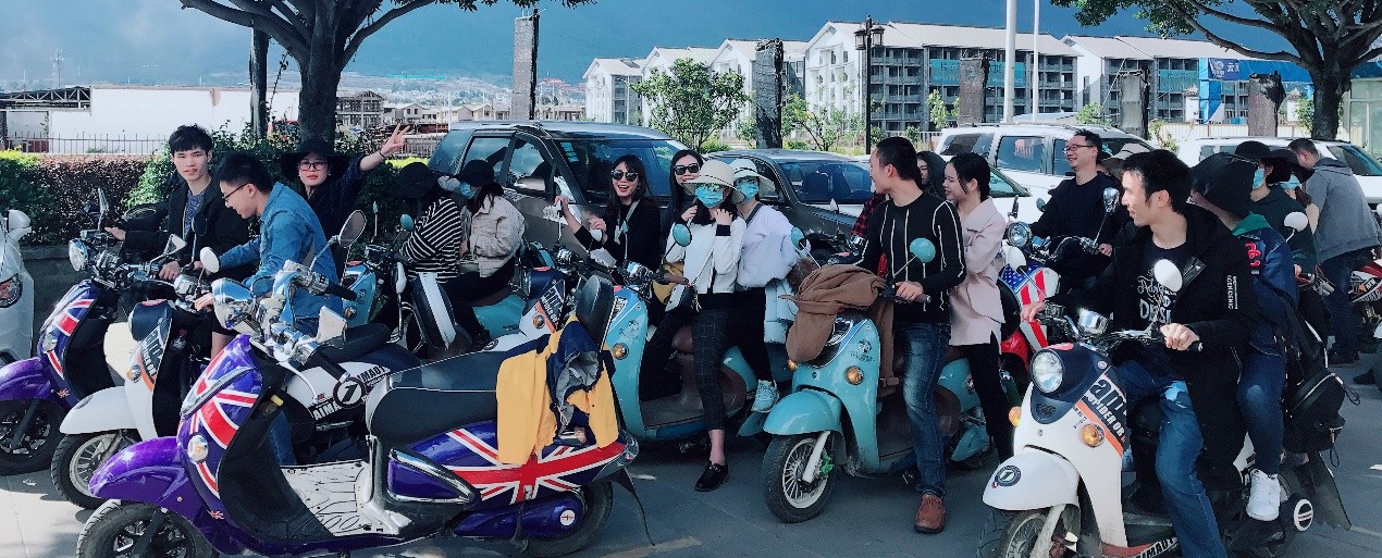 酒店旁边有几家租车行,可以为环游洱海提供交通工具。在休息期间,大家便在微信群里商讨确定了骑电动车来环游洱海。下午两点半,大家准时在酒店门口集合分组,以两人、四人为小组共租赁14辆电动车和2辆电动汽车,组成瑞方骑行队。